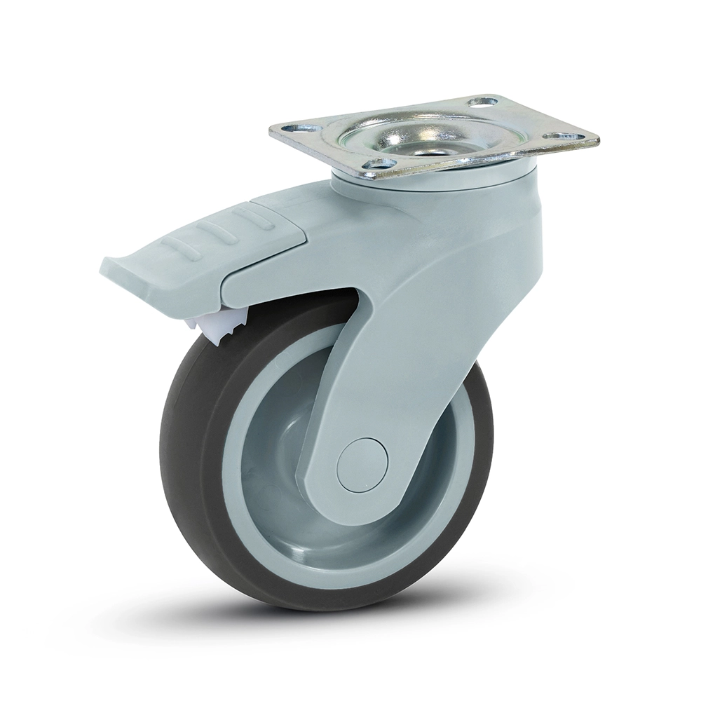 Rueda giratoria de plástico gris frenada con placa superior - 100mm - 100kg