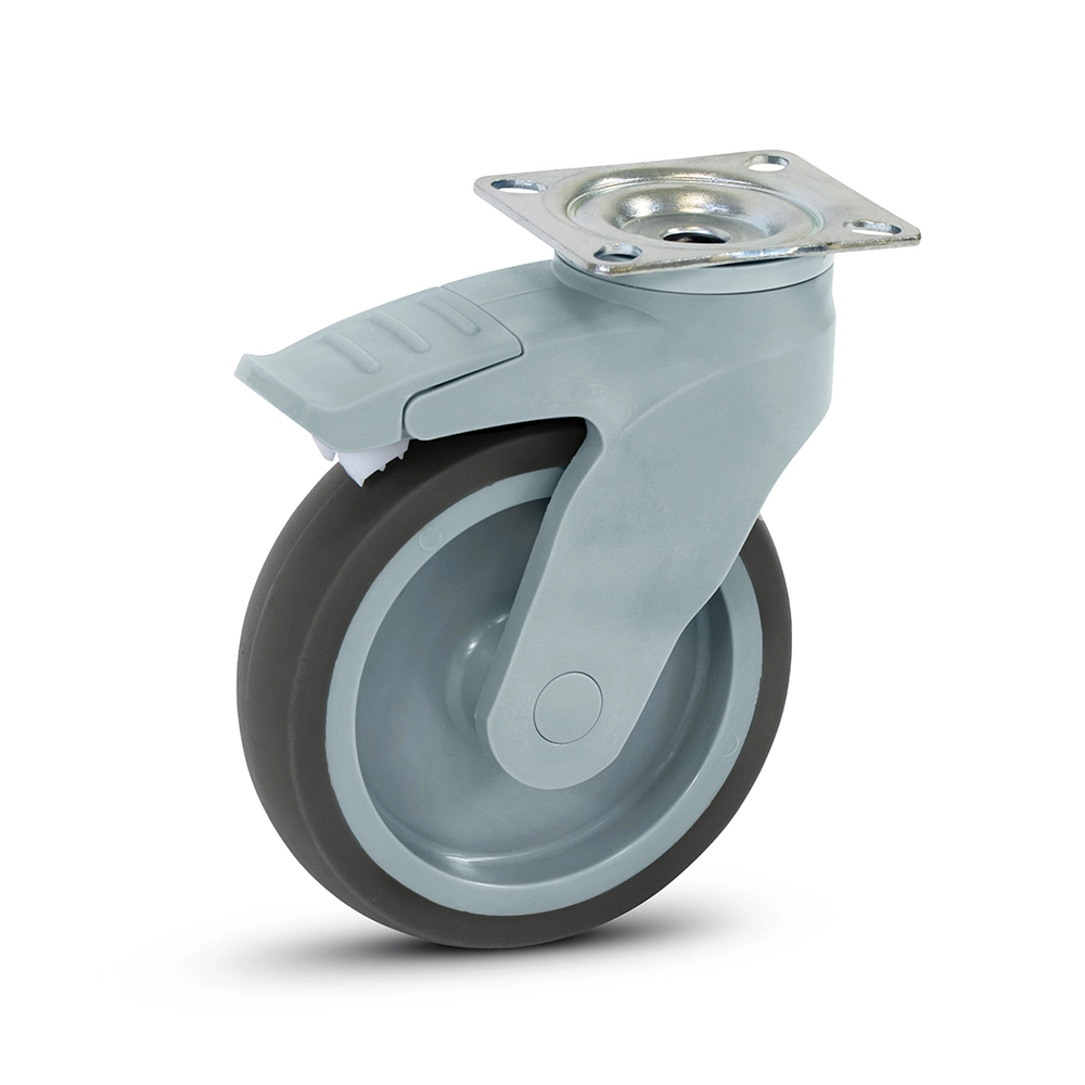 Rueda giratoria de plástico gris con freno y placa superior - 125mm - 100kg