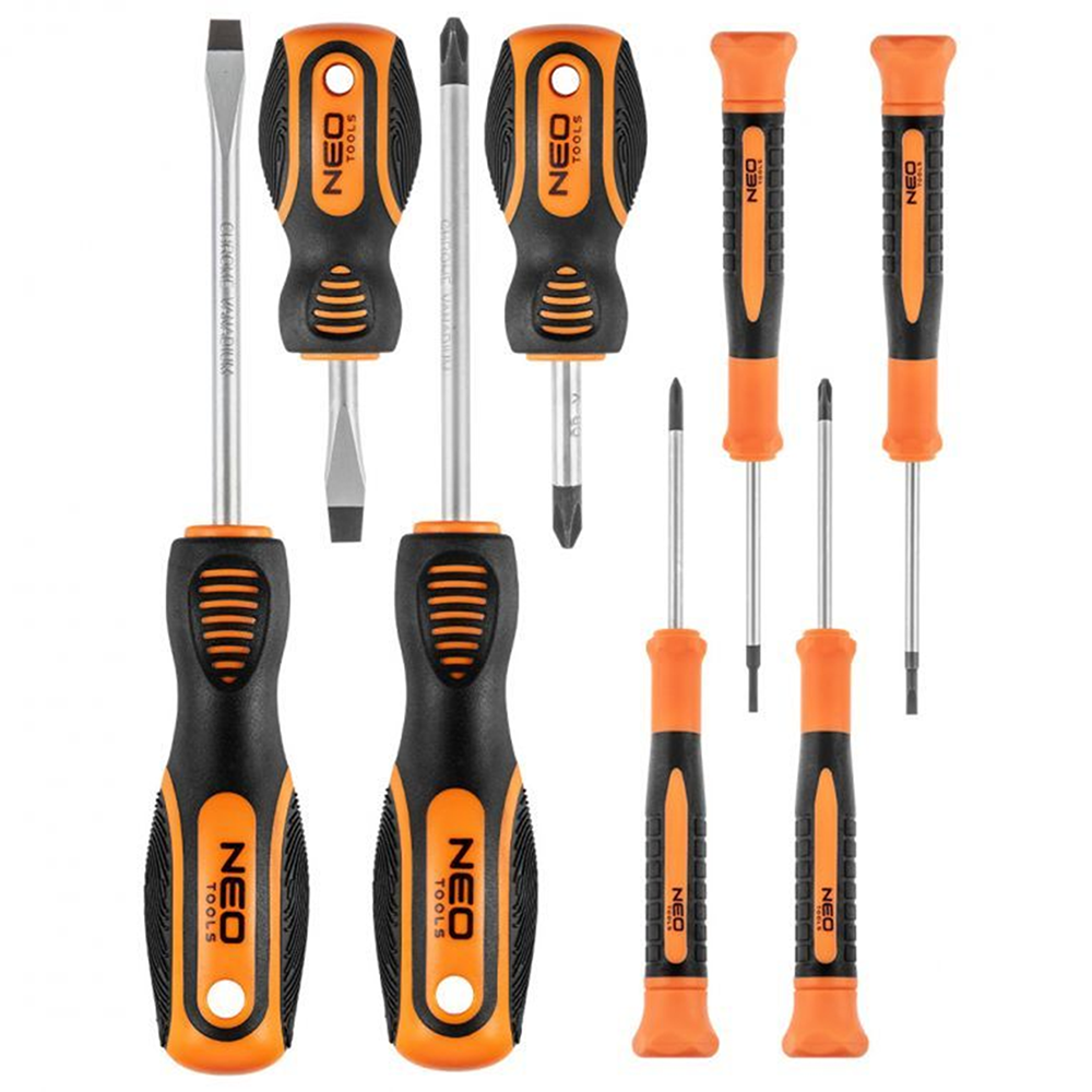 El juego de destornilladores Neo de 8 piezas es una colección de herramientas versátil y esencial para cualquier uso doméstico o profesional. El juego incluye diferentes destornilladores diseñados para adaptarse a diferentes cabezas y tamaños de tornillos, proporcionándole la herramienta adecuada para diversas tareas. Cada destornillador tiene un mango ergonómico para mejorar el agarre y la comodidad durante el uso. Fabricadas con materiales de alta calidad, estas herramientas están hechas para durar y soportar un uso regular. El juego de Neo es perfecto para cualquiera que necesite destornilladores fiables y duraderos, por lo que es un excelente complemento para cualquier caja de herramientas.
