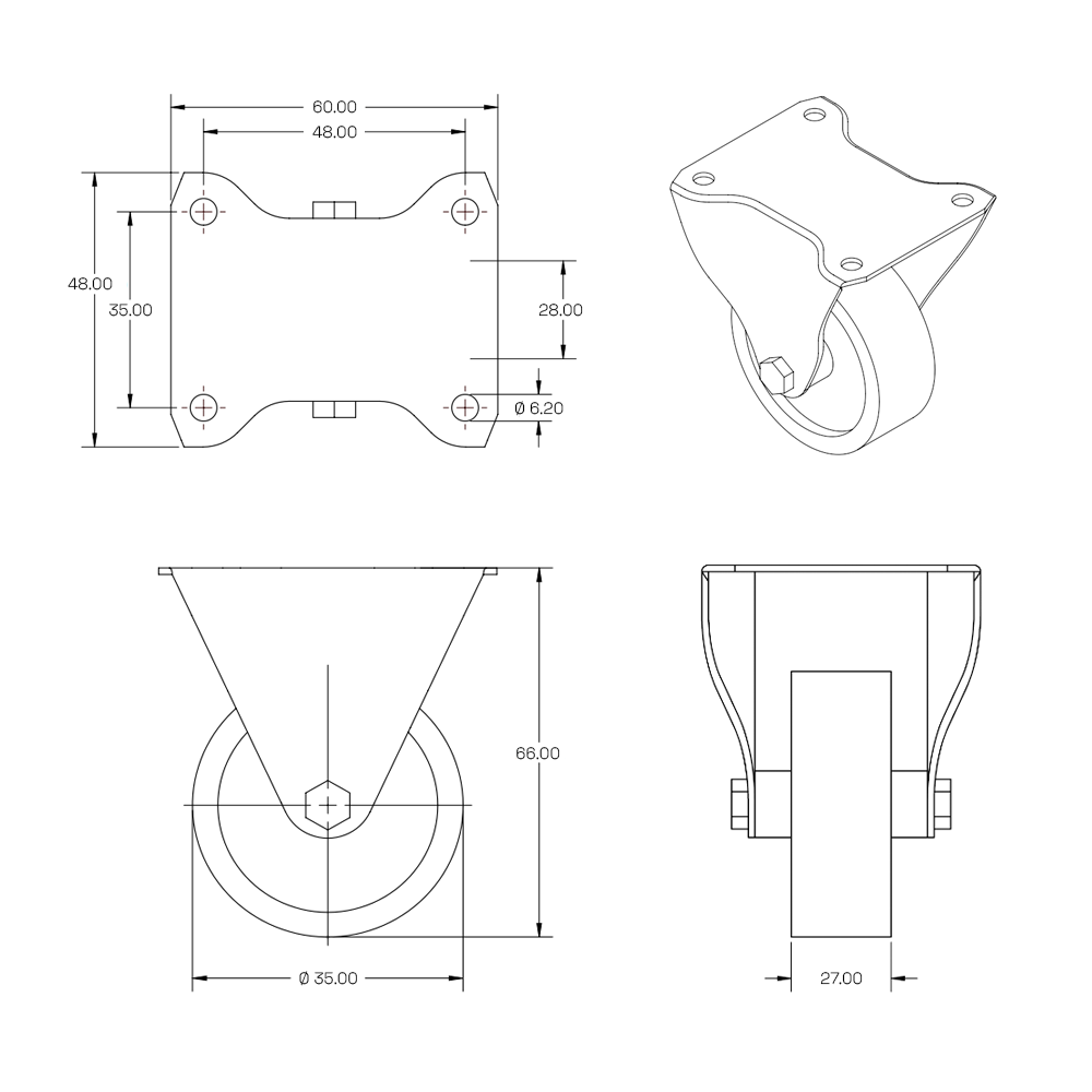 Rueda fija negra de PU de 35 mm con una impresionante capacidad de carga de 100 kg.