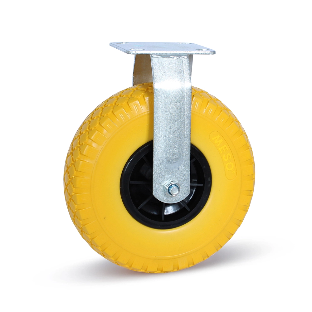 Rueda fija con neumático de PU antifugas. Con una capacidad de carga de 75 kg. Muy adecuada para uso en exteriores.