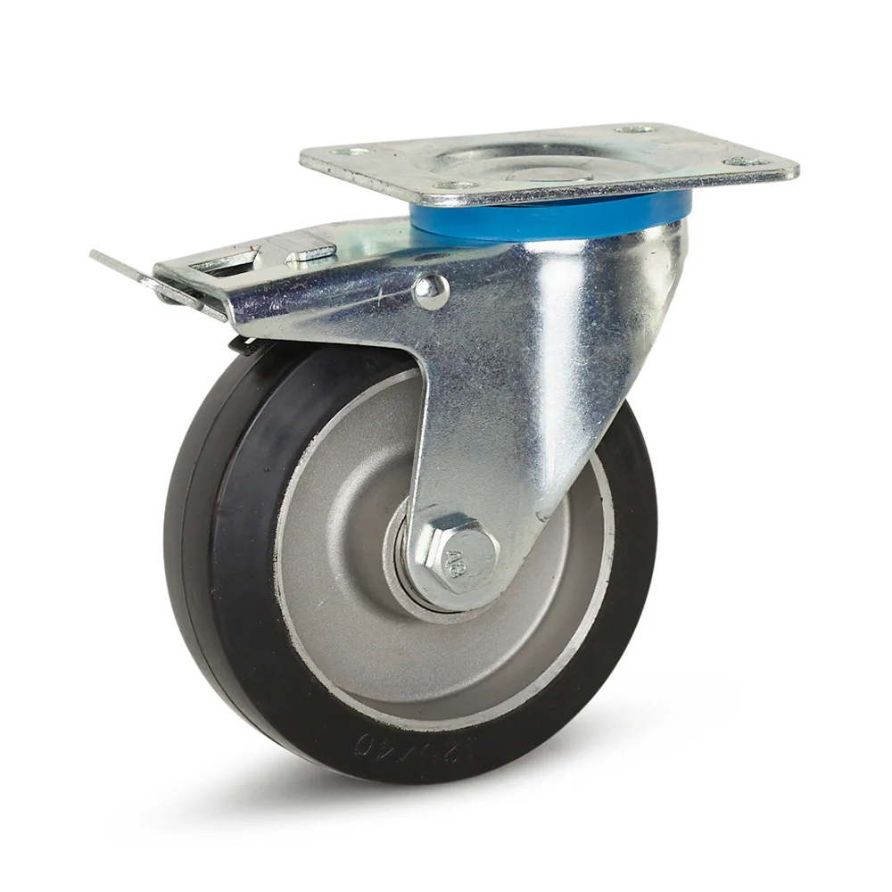 Rueda giratoria de goma elástica negra frenada con placa superior - 125mm - 300kg