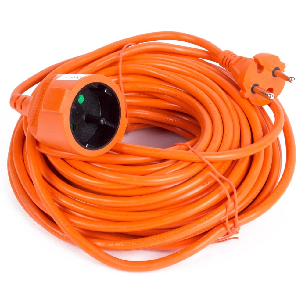 Un llamativo alargador naranja de 20 metros con una carga máxima de 3500 vatios, perfecto para un uso seguro en interiores y exteriores.