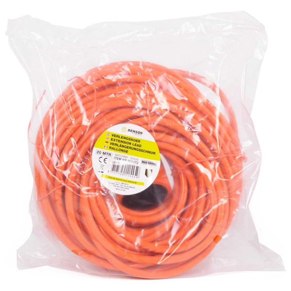 El alargador Benson de 20 metros combina una longitud extra con la máxima visibilidad gracias a su llamativo diseño naranja. El duradero cable de 2x1,5 mm2 puede soportar hasta 3500 vatios, lo que lo convierte en una opción versátil para una gran variedad de aplicaciones, tanto en interiores como en exteriores. El color naranja brillante proporciona seguridad adicional en lugares de trabajo concurridos o al aire libre en el jardín.