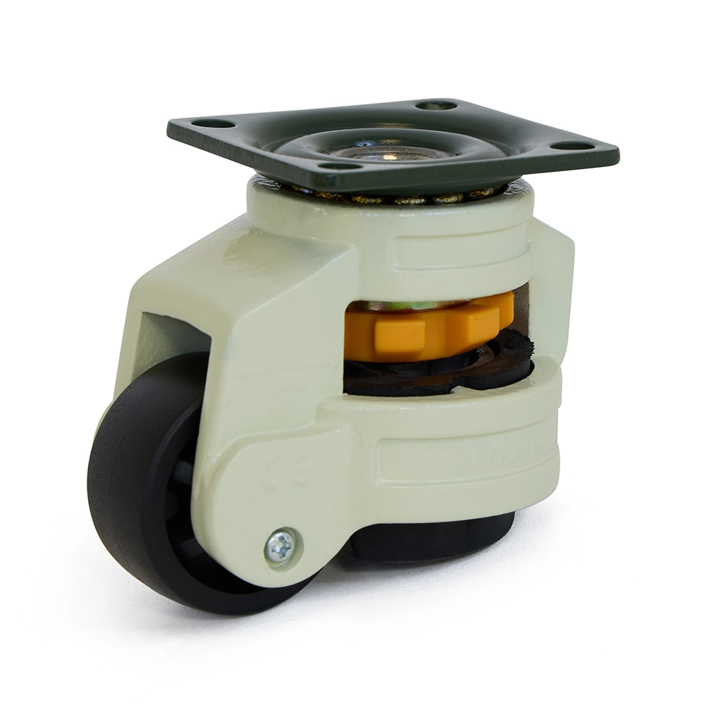 Esta rueda elevadora está equipada con un mecanismo de elevación integrado. Cuando se levanta, la rueda se despega completamente del suelo y la aplicación queda estable en su sitio. Esto hace que la rueda sea muy adecuada para muebles y equipos de transporte que necesitan ser maniobrables y estar sujetos de forma segura sin freno.