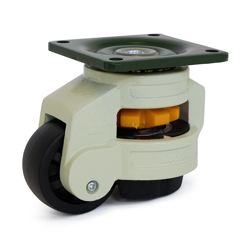 Este tipo de rueda elevadora se utiliza mucho bajo muebles más pesados y soluciones de transporte, como jardineras, perros para muebles, carros de almacenamiento, recogepedidos, camiones de plataforma, carros de limpieza, carros de transporte, muebles de barbacoa, construcciones, flight cases, construcción de maquinaria, andamios, bancos de trabajo y diversos carros de taller.